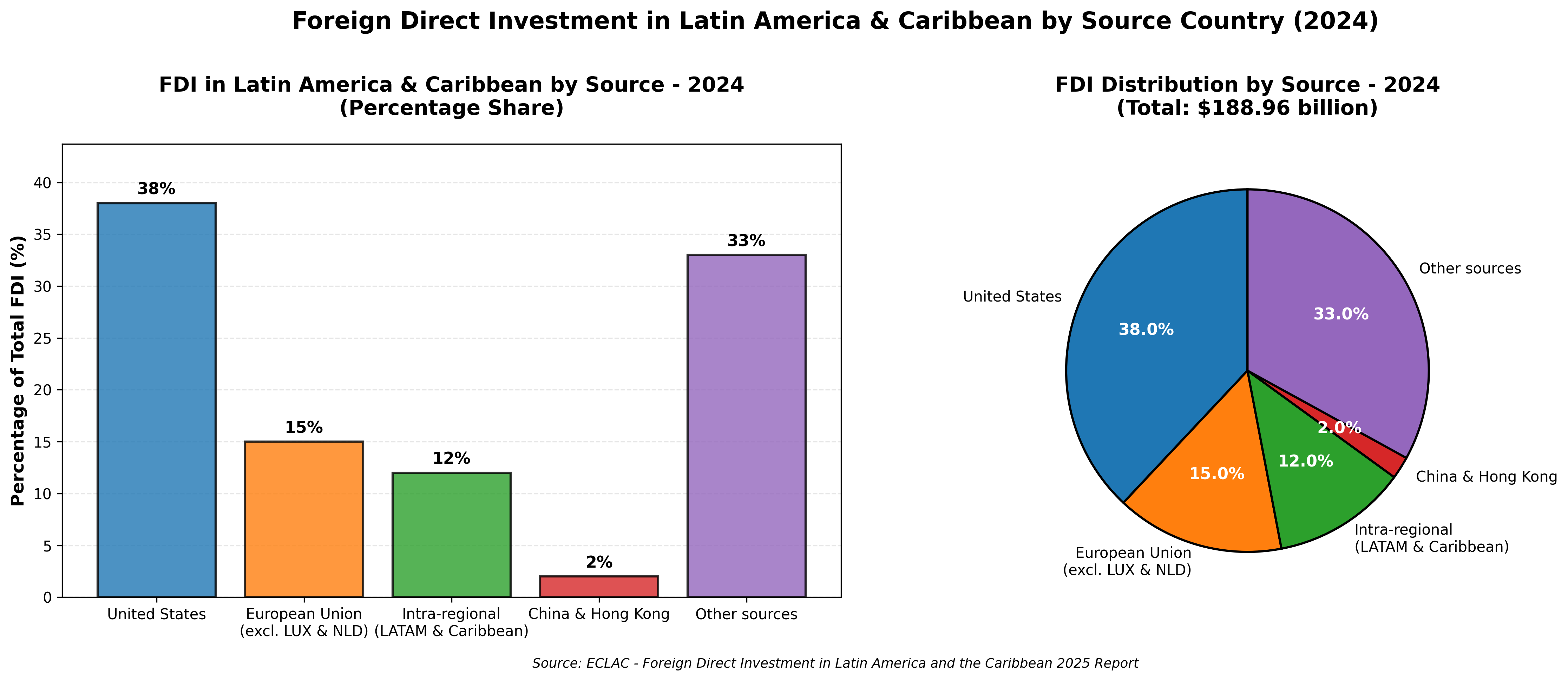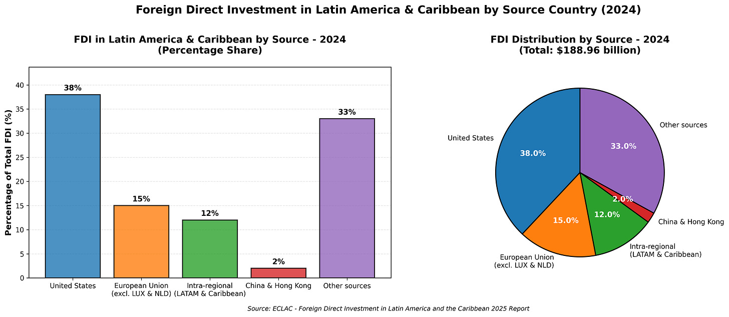 As you can see from the chart above, the US is by far the largest single source of Foreign Direct Investment (FDI) into the region. Yet, the investment is largely focused on business operation expansion, either through supply chain nearshoring or increasing local services (such as GE expanding a local subsidiary). This leaves a sizable gap for more capital heavy investments in infrastructure projects and resource extraction—vitally needed spending that is dominated by Chinese firms yet doesn’t appear in FDI calculations.