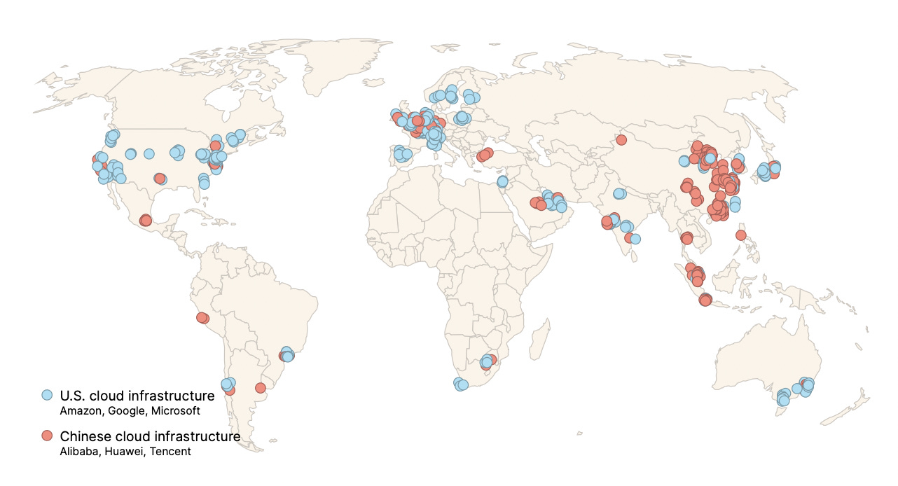 While traditionally these projects have taken the form of ports, roads, dams, etc, there’s a hot new infrastructure project on the mind and budget of almost every state: data centers. Previously used to store the data and run the operations of digital services, data centers have taken on a supercharged importance as their GPUs (Graphics Processing Units, or what Nvidia sells) have been used to train and run ever-more-powerful AI models. As geopolitics has grown increasingly ruptured, countries have only increasingly seen the need to ensure domestic data storage capacity and domestic AI inference capabilities. They have, I would argue, become critical infrastructure reminiscent of the industrial bases, or lack thereof, which created traditional extractive economies. And, they are currently extremely concentrated in the hands of a few companies and states.